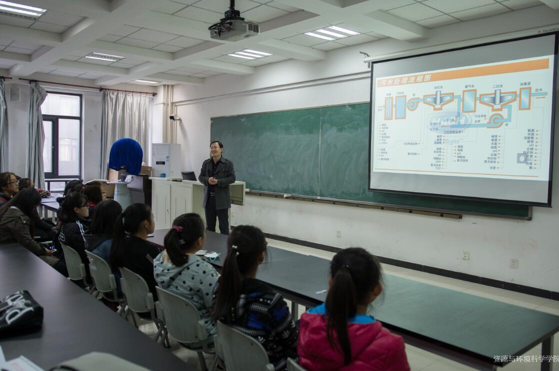 张鉴达副教授结合实验室的污水净化处理模拟系统为学生们带来了一场“废水的治理方法与流程”的探索之旅,生动形象地为同学们介绍了城市生活污水和工业废水的典型处理方法和工艺。学习中,同学们驻足于废水处理模拟实验装置、充氧能力测定装置、SBR法间歇式实验设备与EGSB污水处理装置前观察探究,他们在感叹处污水处理的难度和精湛的技术工艺之外,也深深体会到了环保的重要性,激发了大家对环境变化与技术研究的浓厚兴趣。